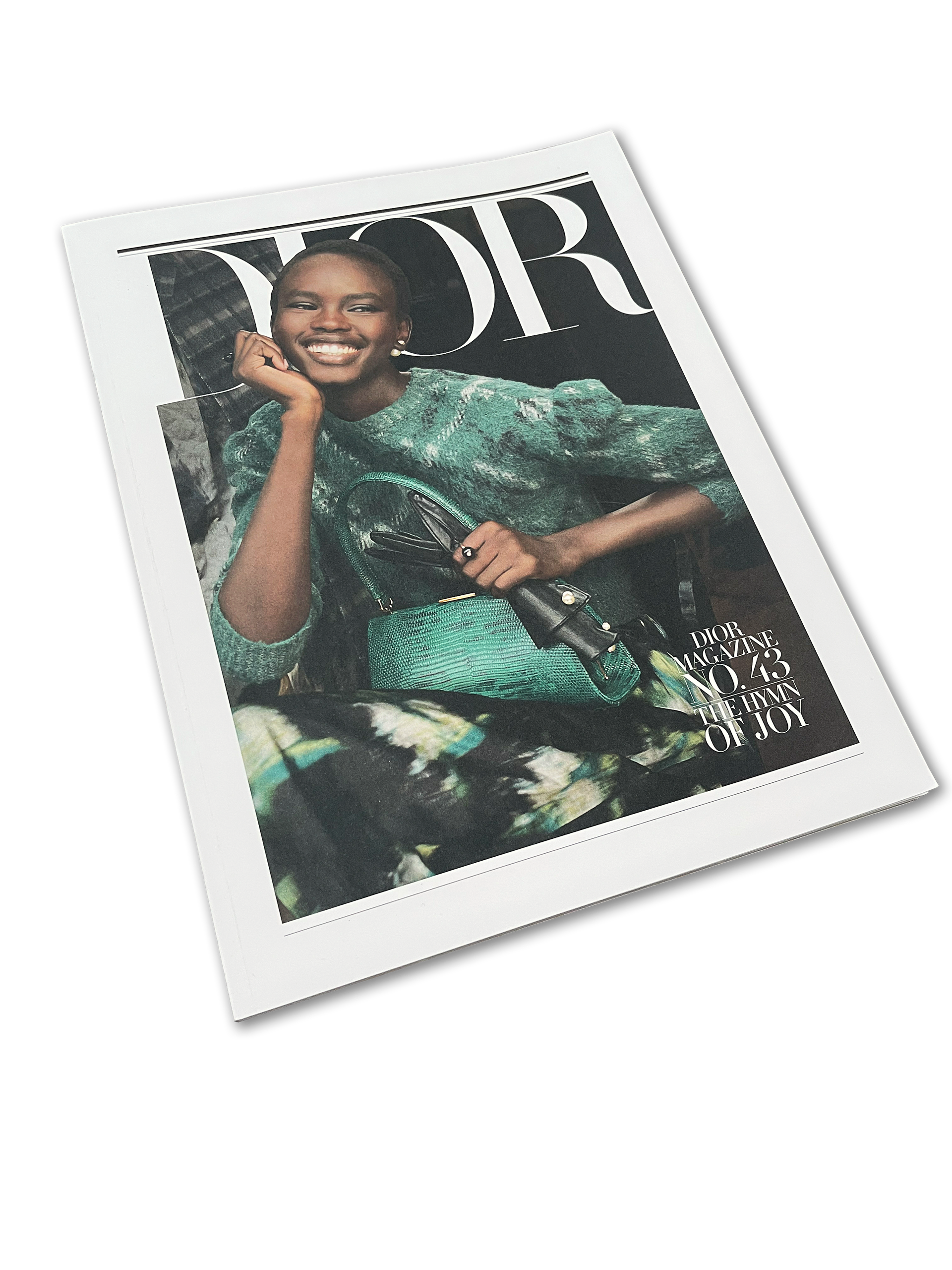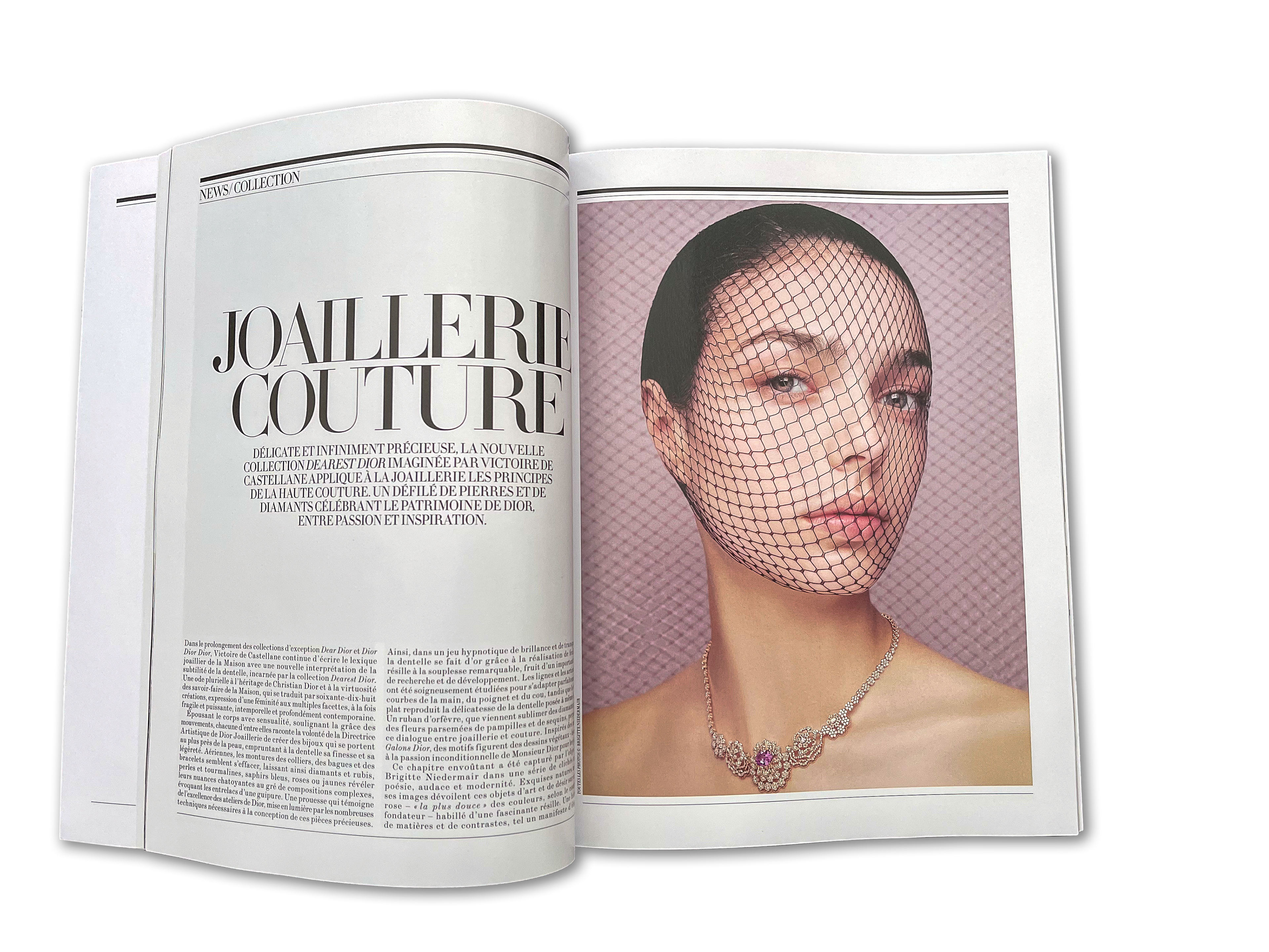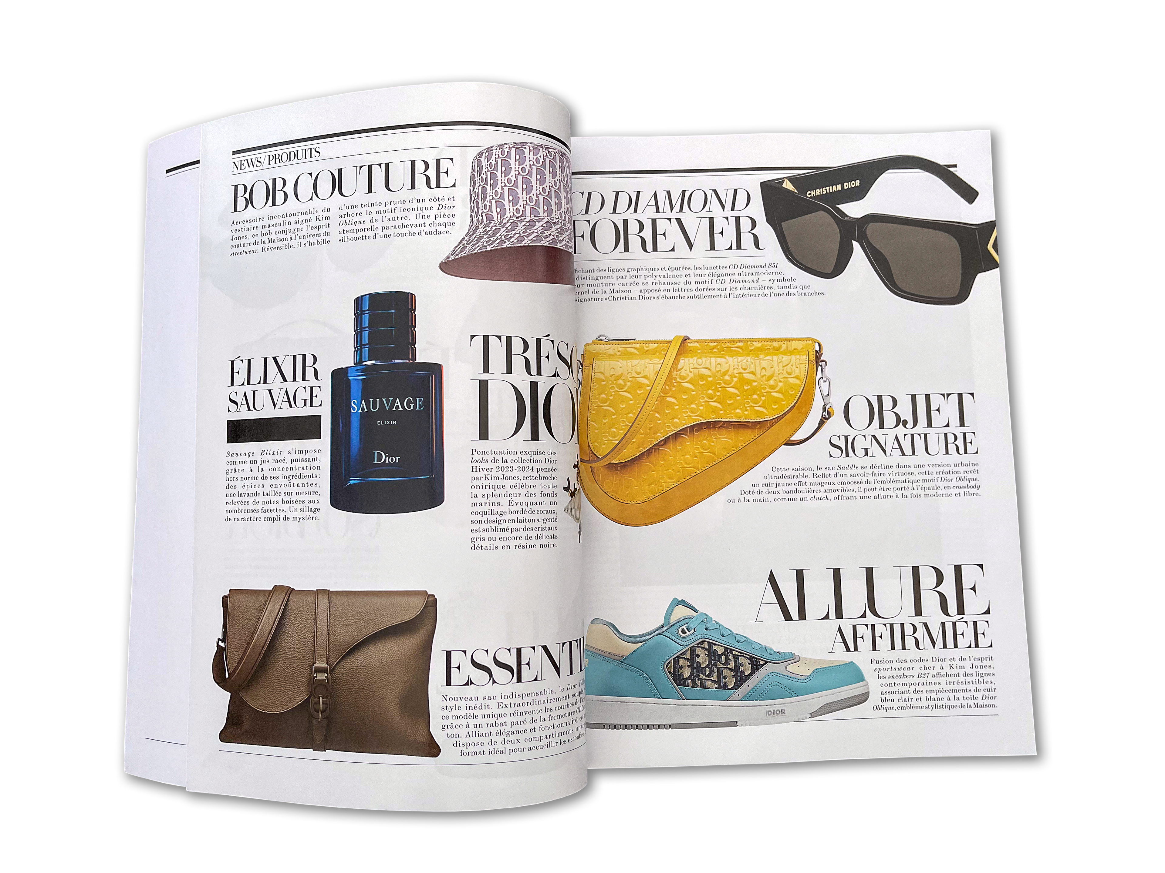 Exécution et mise en page du magazine Dior. Gris typo, césures, 10 langues à gérer.