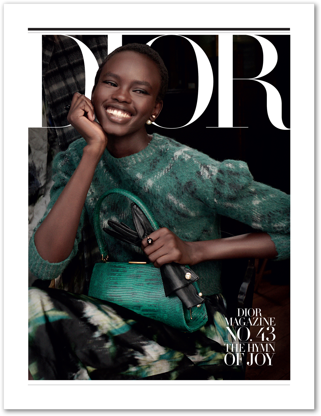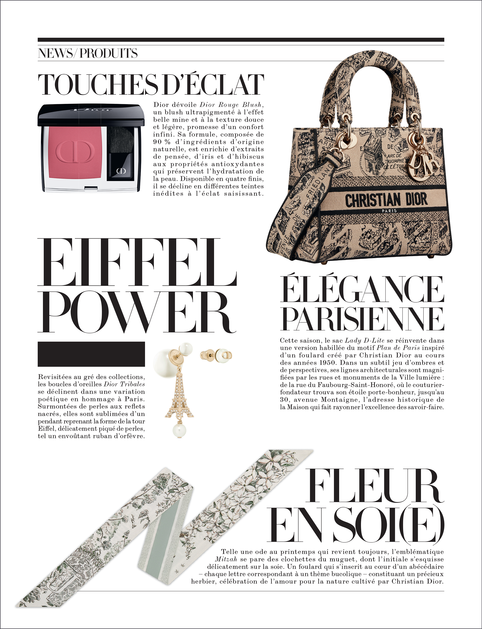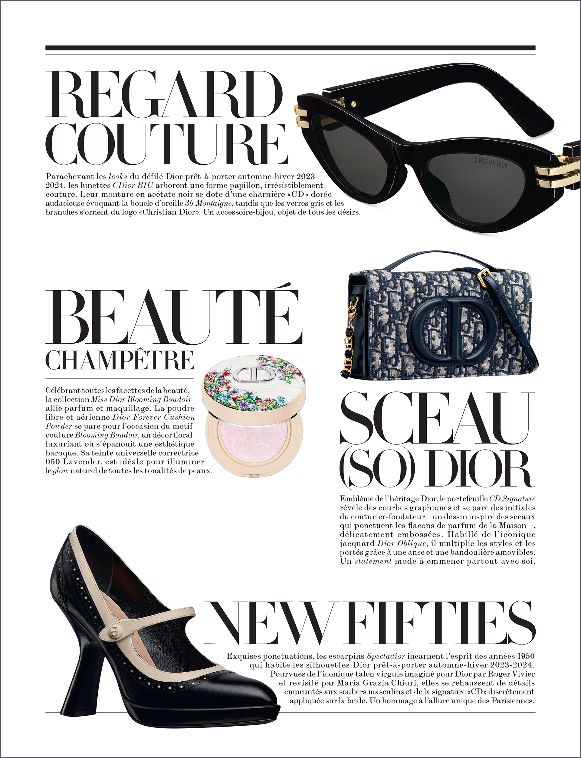 Exécution et mise en page du magazine Dior. Gris typo, césures, 10 langues à gérer.